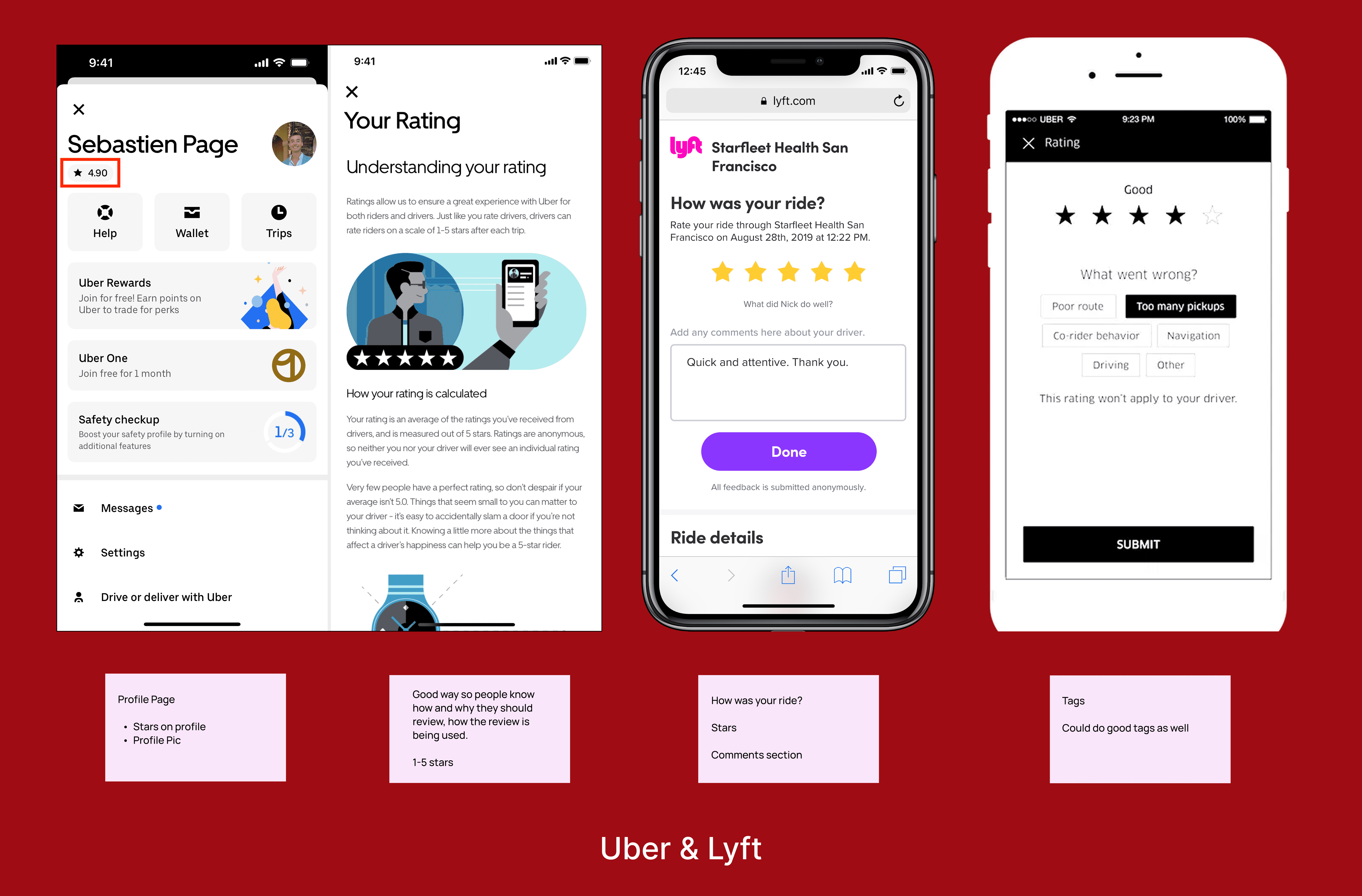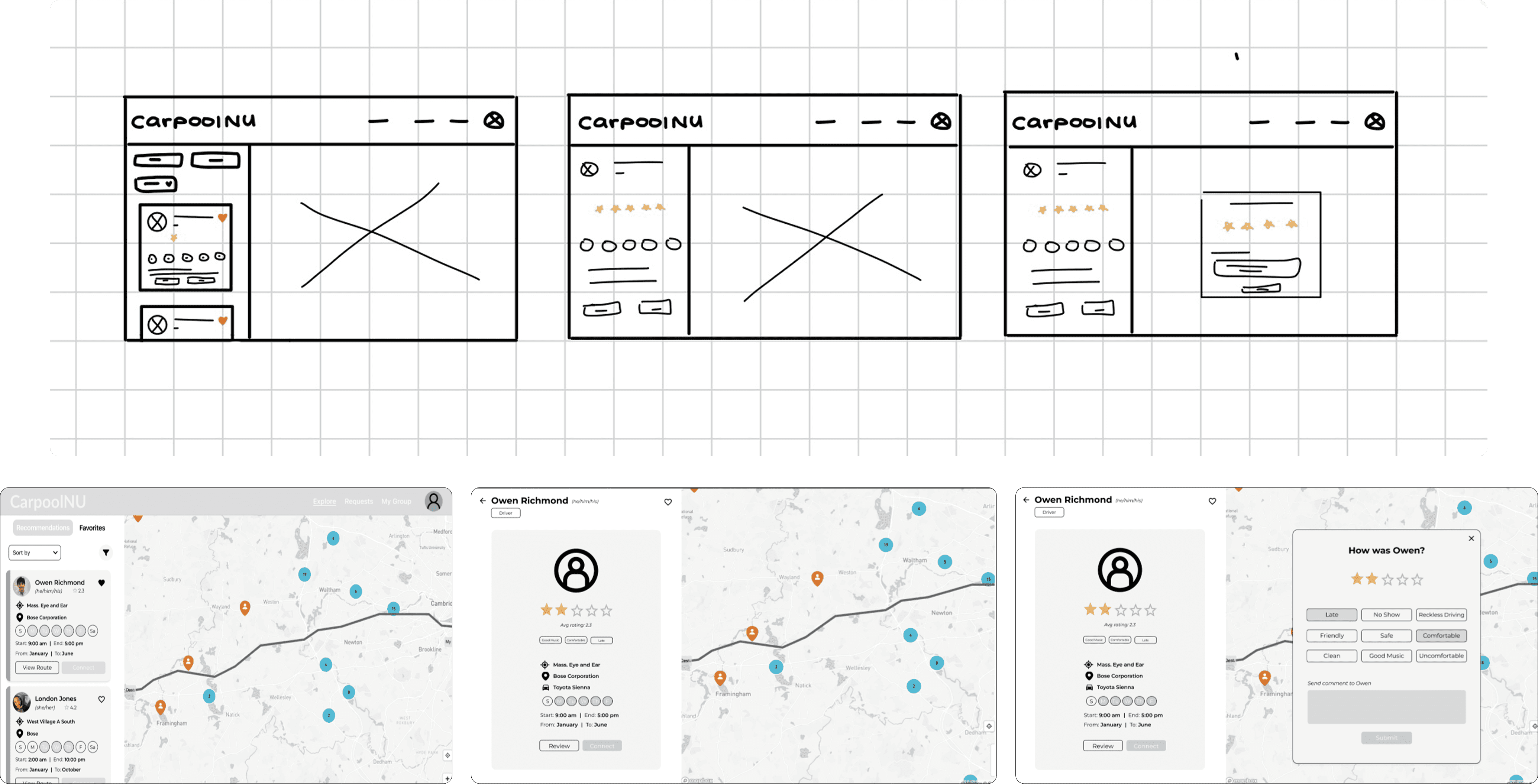 To visualize these new features, I developed wireframes and lo-fidelity mockups. For inspiration, I looked at how established ride-sharing apps like Uber and Lyft handle reviews and profiles, adapting their successful approaches to fit the unique context of Sandbox and CarpoolNU.