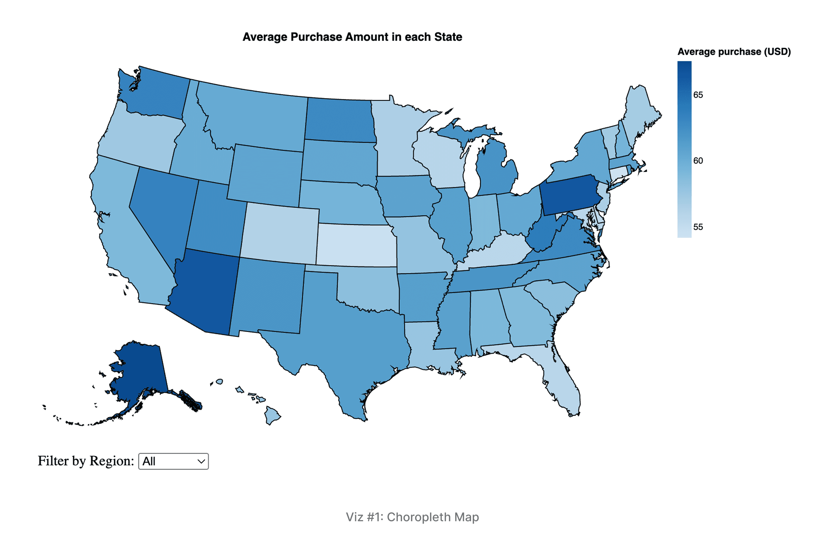 Description & Interactivity: A choropleth map using color intensity (darker blue) to encode the average purchase amount per US state. The map is interactive, allowing hover-over tooltips to display state-level metrics (e.g., average purchase, unique customers, region) and a region filter to isolate views (Northeast, South, etc.).