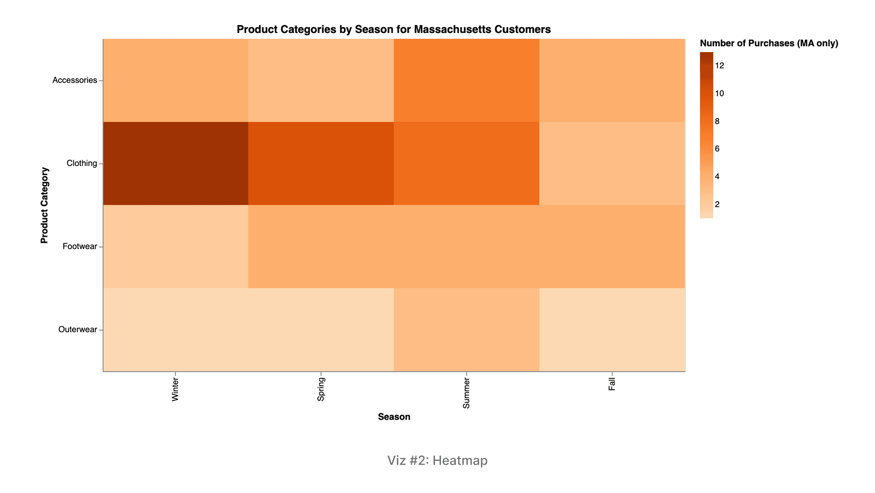 Description & Interactivity: A heatmap for Massachusetts customers comparing Product Categories (Y-axis) against Seasons (X-axis). Color intensity (deeper orange) encodes the Number of Purchases. Interactivity includes hovering to reveal the exact purchase count and the percentage of that season's total.