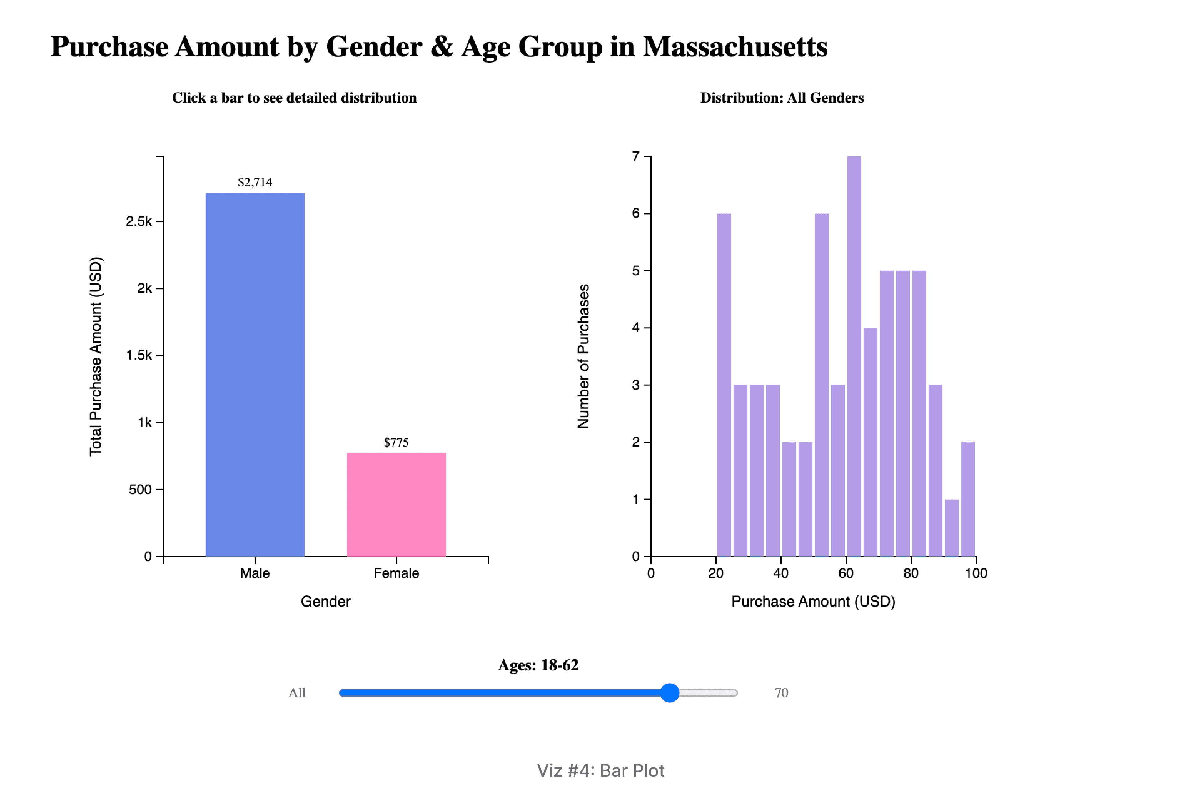 Description & Interactivity: A bar chart visualizing total purchase amounts by gender in Massachusetts. The Y-axis encodes the total purchase amount. The visualization features a continuous age slider that allows users to set a maximum age threshold, providing a cumulative view of spending across different age cohorts.