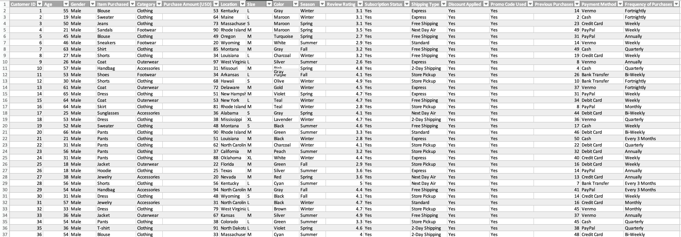 Customer ID (int), Age (int), Gender (string), Item Purchased (string), Category (string), Purchase Amount (USD) (int), Location (string), Size (string), Color (string), Season (string), Review Rating (float64), Subscription Status (string), Shipping Type (string), Discount Applied (string), Promo Code Used (string), Previous Purchases (int), Payment Method (string), Frequency of Purchases (string)