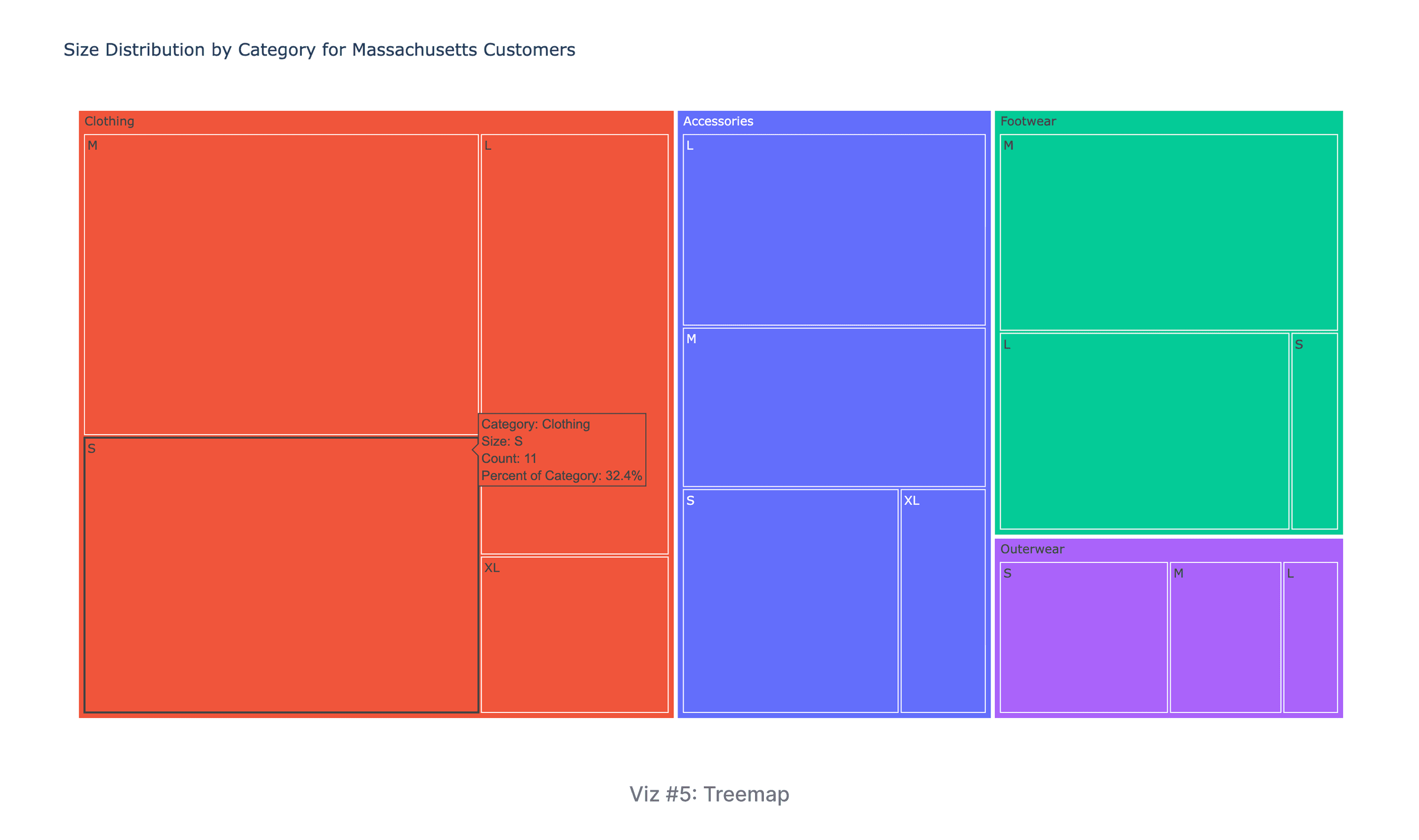Description: A treemap showing how size purchase counts are distributed within each product Category. The area of the nested rectangles encodes the number of purchases for a specific size/category combination, and color is used to distinguish the product categories.
