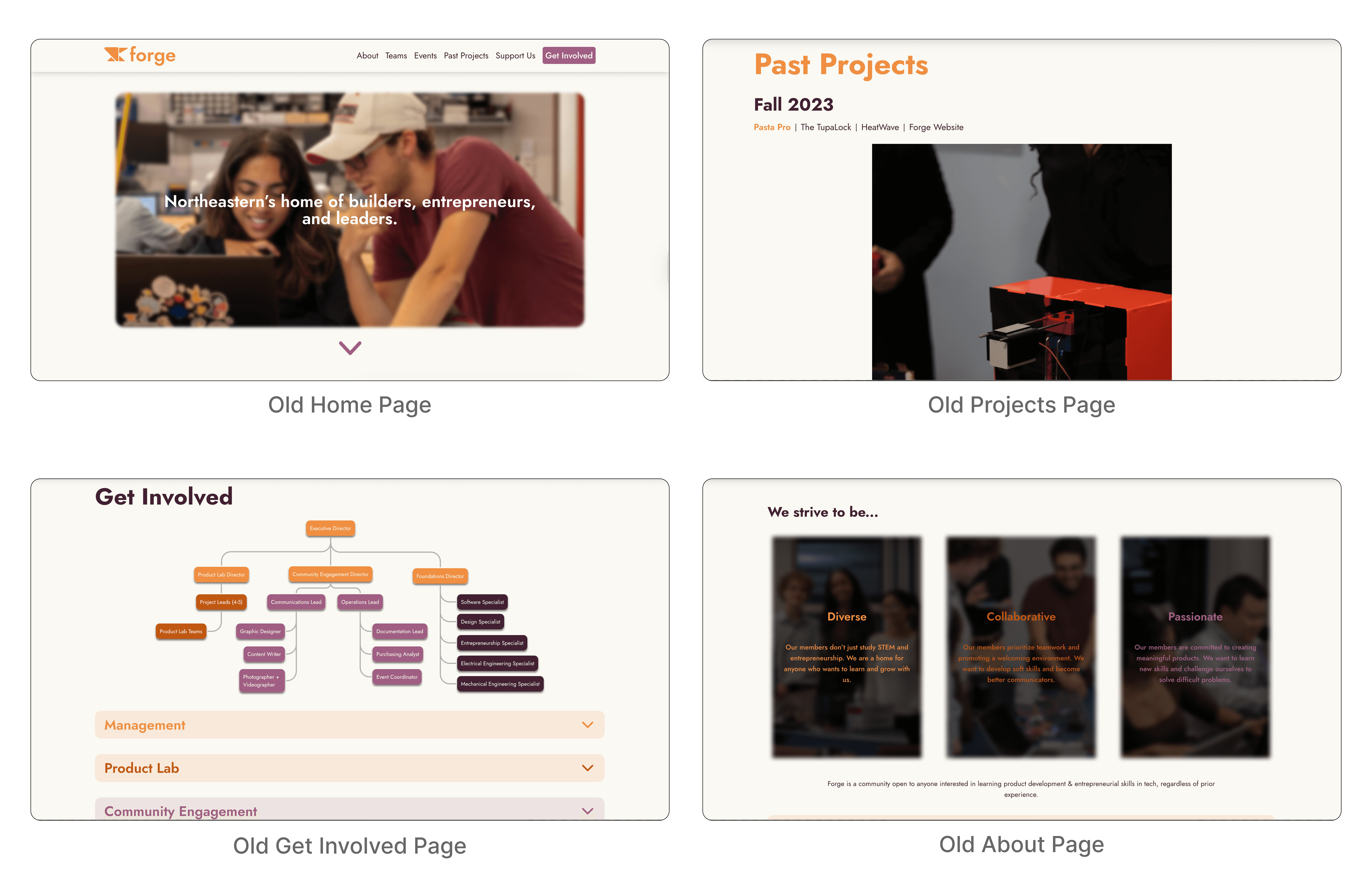 Forge is Northeastern University's Product Development Studio, operating under the Sherman Center. Forge is dedicated to teaching students entrepreneurial and engineering skills through hands-on workshops, speaker events, and collaborative projects. The primary objective of the website is to effectively convey Forge's vision and connect with more Northeastern students. As the website team lead, I am responsible for leading a team of 5 in crafting and implementing a digital platform that is simple, informative, and user-friendly.