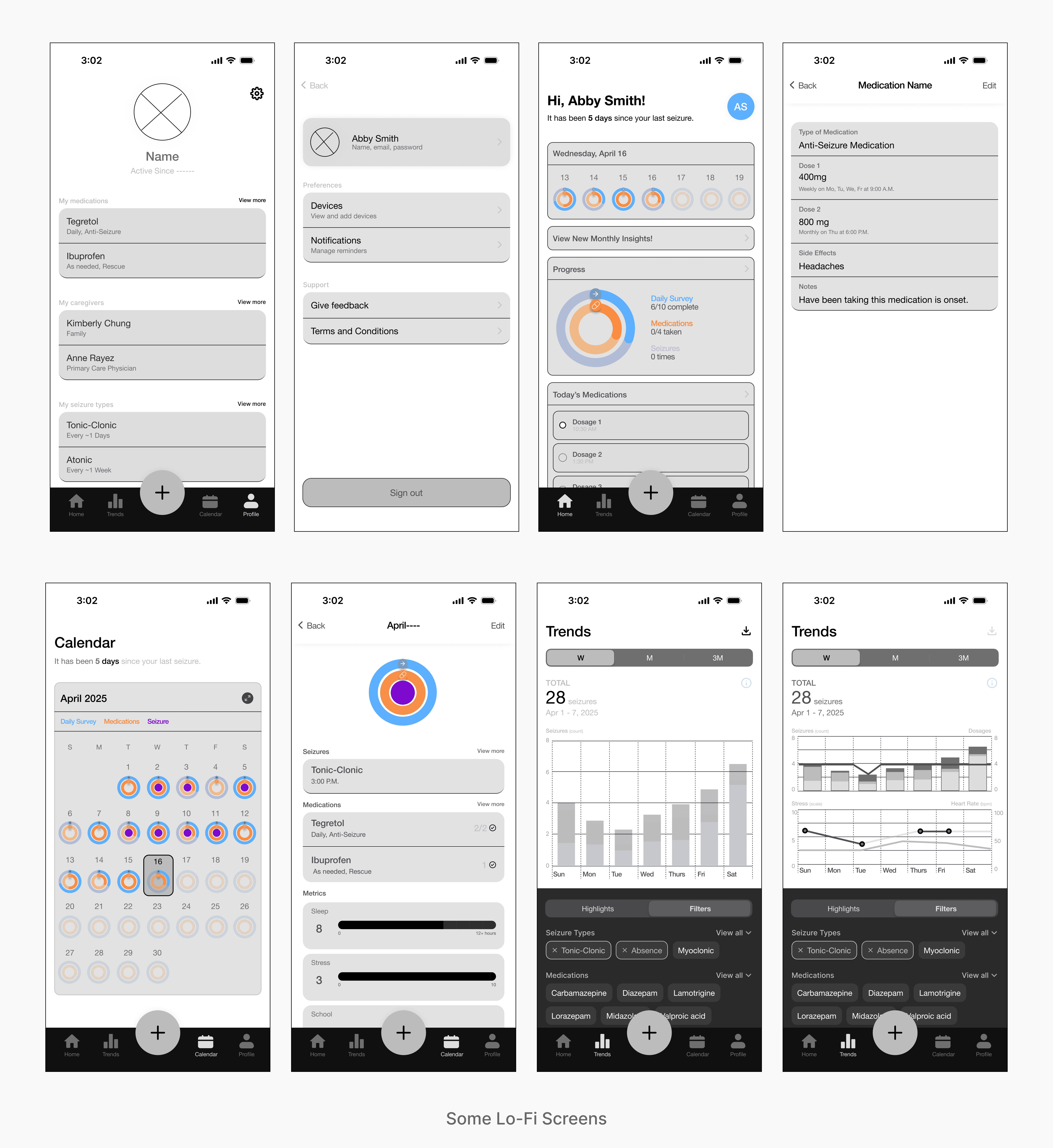 Building on our paper wireframes, we created low-fidelity wireframes for each user flow. Our primary goal was to get feedback on ease of use, navigation, and the intuitiveness of the personalization and customization features. This process involved numerous iterations, particularly for the Trends page, where we focused on refining the data visualizations to be as clear and insightful as possible. Feedback and usability testing from Mukki, our team members, caregivers, healthcare professionals, and members of the epilepsy community were crucial in driving improvements and ensuring the final design was truly user-centered.
