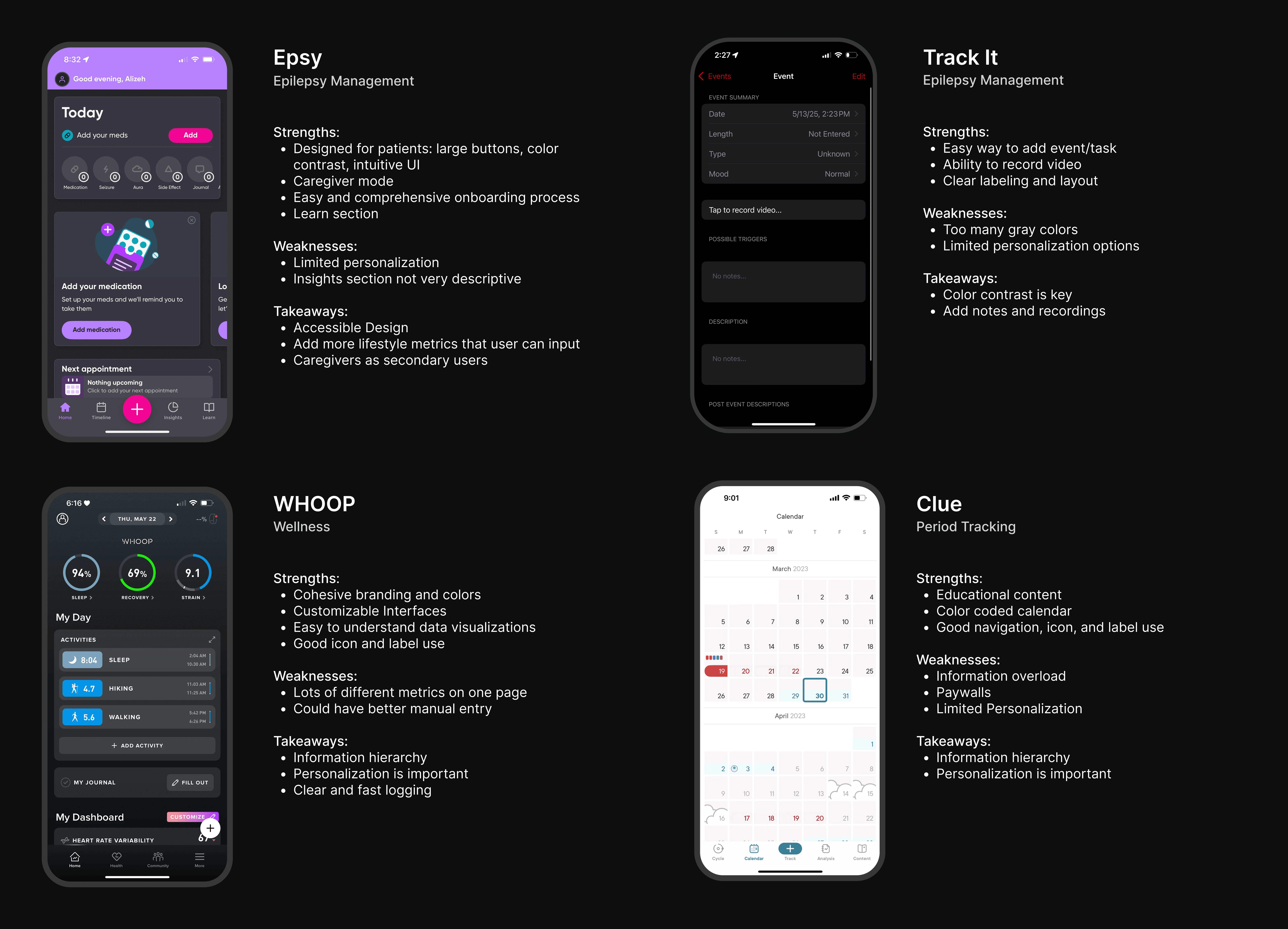 We looked at existing epilepsy and wellness tracking apps, focusing on their approaches to data entry, visualization, and personalization. This research was crucial in understanding current user familiarity and identifying key opportunities for ZOR! to differentiate itself, introduce innovative features, and establish competitive advantages by addressing what other apps do well and where they fall short.